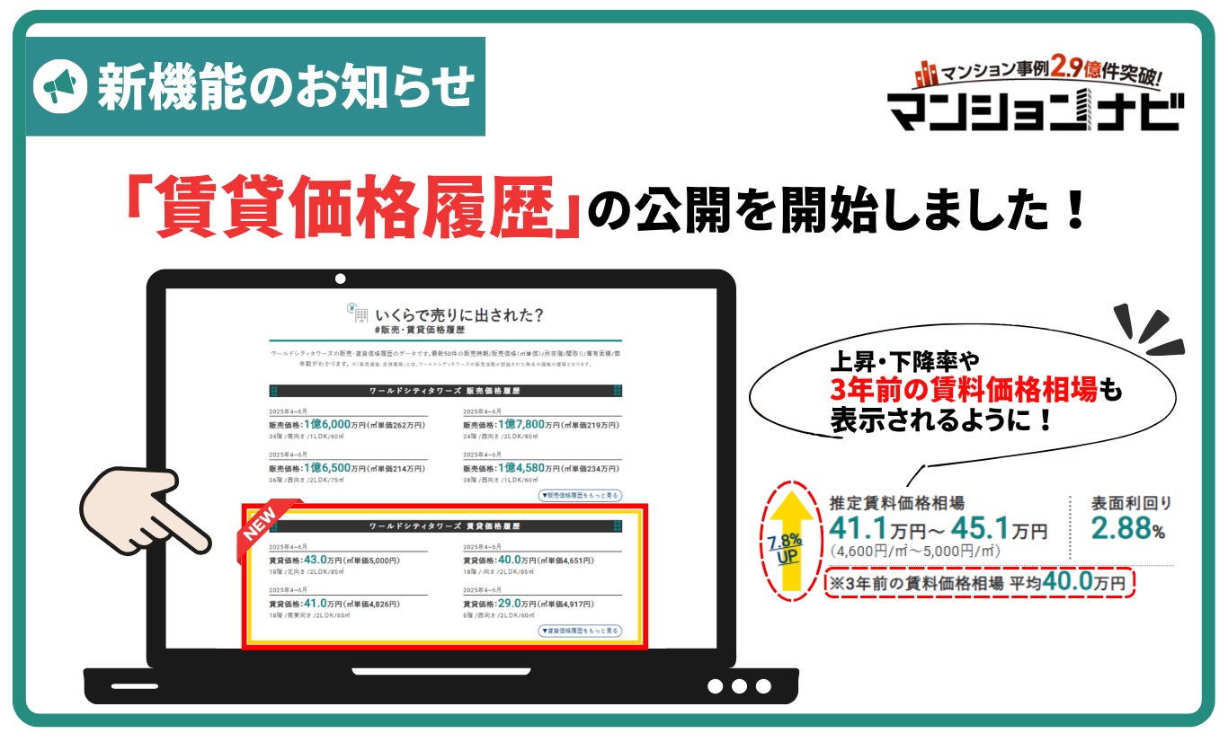 マンションリサーチ株式会社(本社:東京都千代田区、代表取締役社長:山田 力)は、マンション市場の長期的な変化を可視化するため、全国14万3,000棟のマンションデータを掲載している「マンションナビ」にて、新機能『賃貸価格履歴』の提供を開始しました。