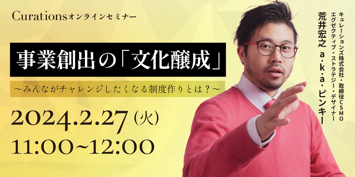 顧客企業のビジネス変革を成功に導くキュレーションズ株式会社(本社:東京都渋谷区、代表取締役社長:根本隆之、以下当社)は、『事業創出の「文化醸成」〜みんながチャレンジしたくなる制度作りとは?〜』を2024年2月27日(火)に開催いたします。
