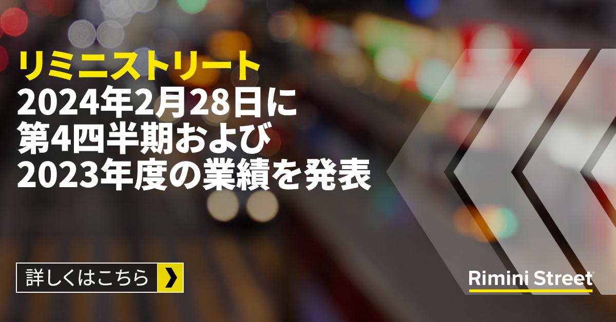 (米国ラスベガス – 2024年2月9日) – エンタープライズソフトウェアのサポート、製品、サービスをエンドツーエンドで提供するグローバル企業であり、OracleおよびSAPソフトウェアに対する第三者保守サービスの主要なプロバイダー、ならびにSalesforceおよびAWSのパートナーであるRimini Street, Inc. (Nasdaq: RMNI)は、2024年2月28日のマーケットクローズ後に業績を発表します。また、リミニストリートは同日に、カンファレンス・コールとウェブキャストを開催します。東部時間午後5時/太平洋時間午後2時から、2023年度第4四半期および会計年度の業績について説明し、2024年度に関するコメントを発表します。