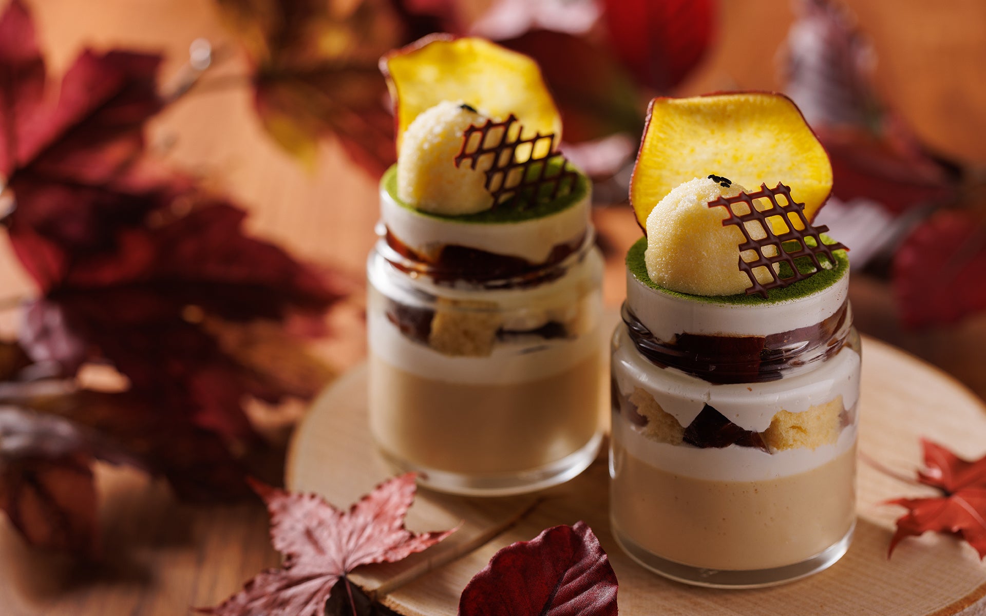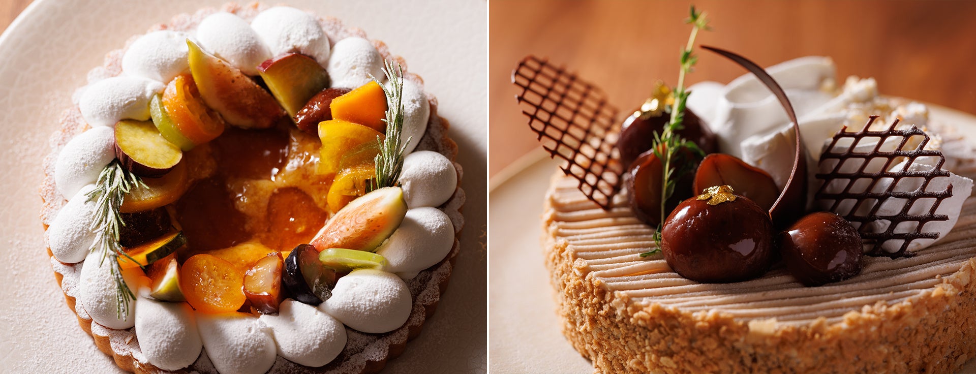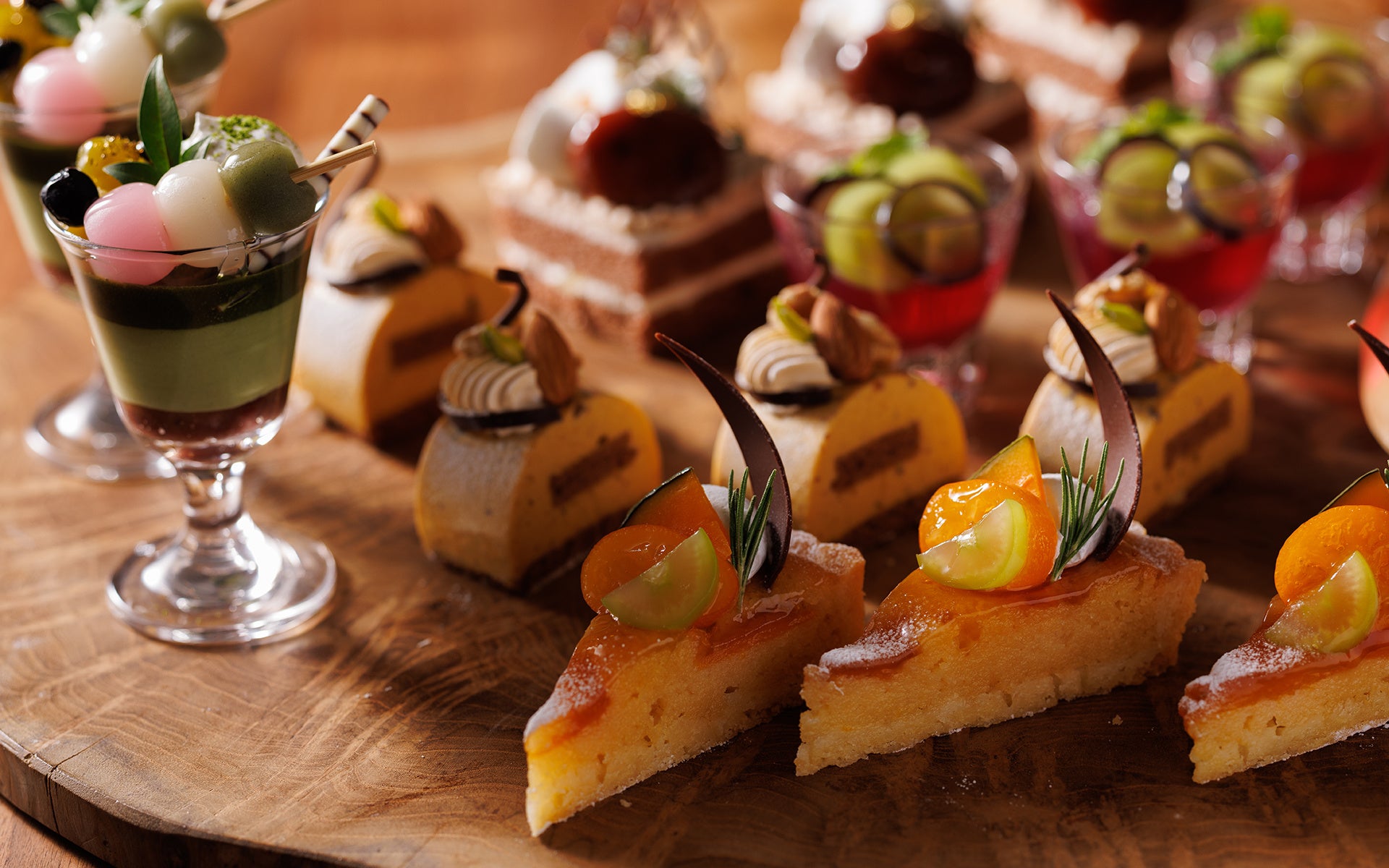 アプリコットのタルトは、秋の味覚のコンポートをトッピング。栗のモンブランは、チョコのスポンジにマロンクリームを乗せました。他にも、葡萄のゼリー、かぼちゃのプリン、抹茶のムースと、盛りだくさんの秋色スイーツビュッフェです。