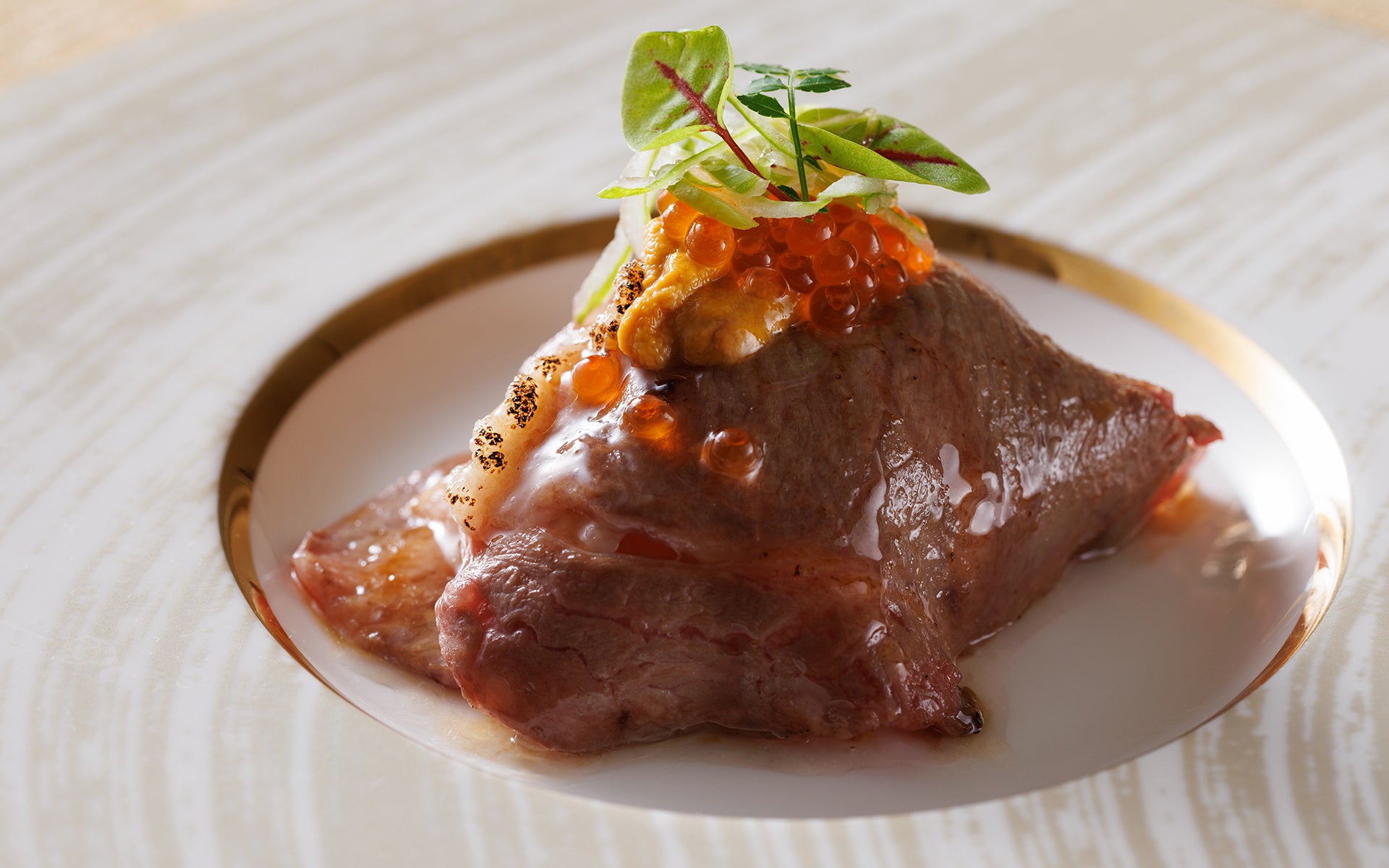 炙り国産牛で包んだジンジャーライス〜ウニとイクラのトッピング〜