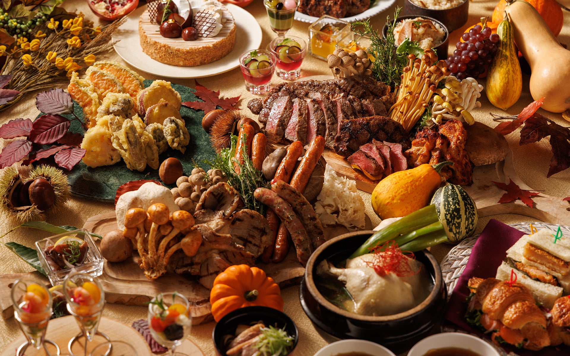 お馴染みの肉や魚のグリル料理に、秋の味覚の山海の幸が加わり、より豪華なラインナップに。“芋・栗・かぼちゃ”を使ったスイーツビュッフェも見逃せません。総料理長が腕をふるった一皿限定料理も登場します。