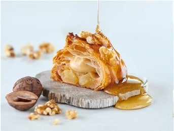 甘酸っぱい角切りリンゴフィリングにコクのある深い甘みと香りのカナダ・ケベック州産メープルシロップを使用したペースト入りカスタードクリームの上品な味わいがよく合います。 仕上げに大粒クルミをトッピング、豊かな香りとカリっとした食感を楽しむアップルパイです。