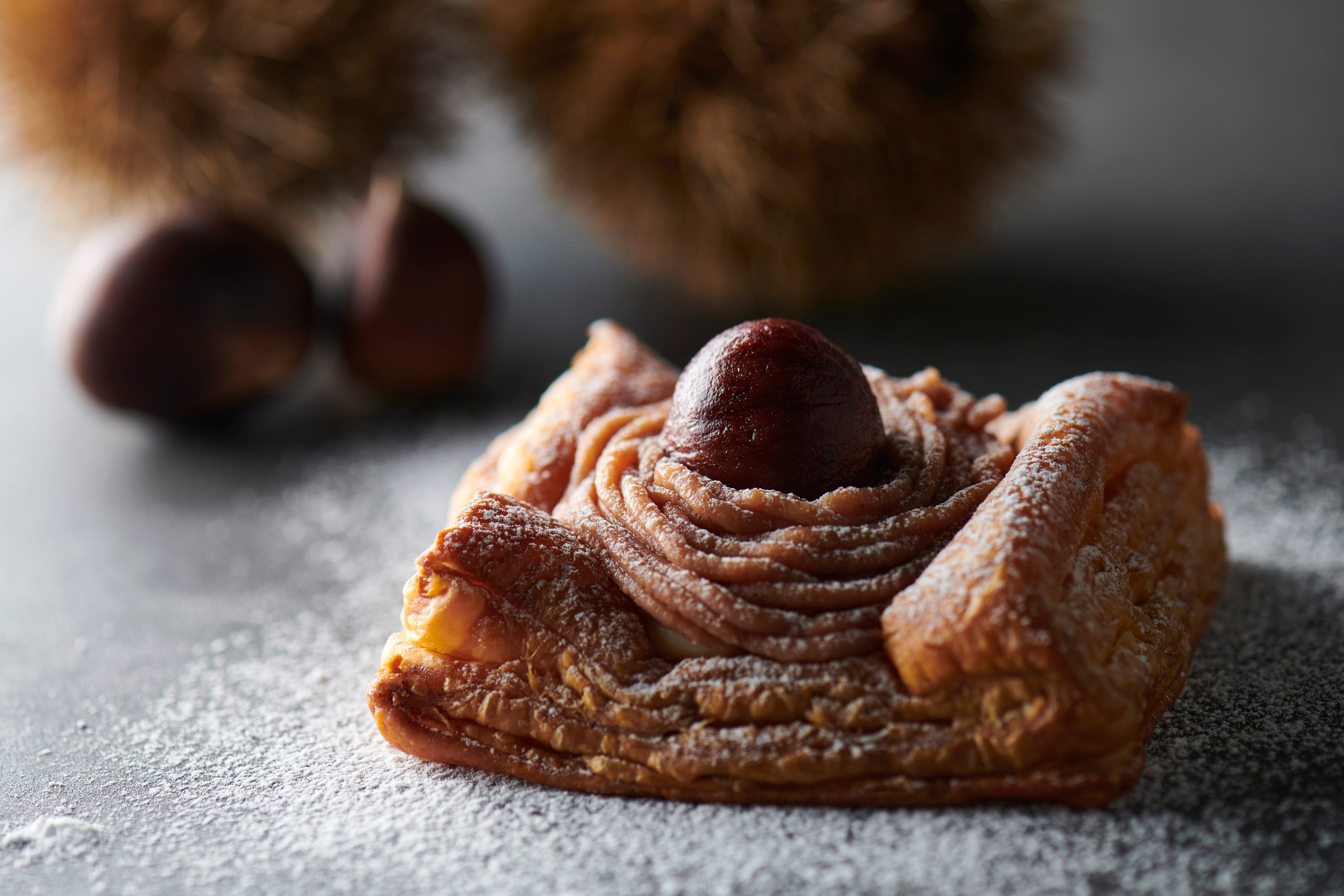 スクエアのサクサクパイ生地にとろりと滑らかなカスタードクリームの上に、豊かな香りと上品な甘さが特長のフランス産のマロンクリームを贅沢に絞り、大粒マロンをトッピングしました。シンプルに仕上げることでRINGO自慢のサクサクパイと濃い栗の味わいをお楽しみいただけるデザートパイです。