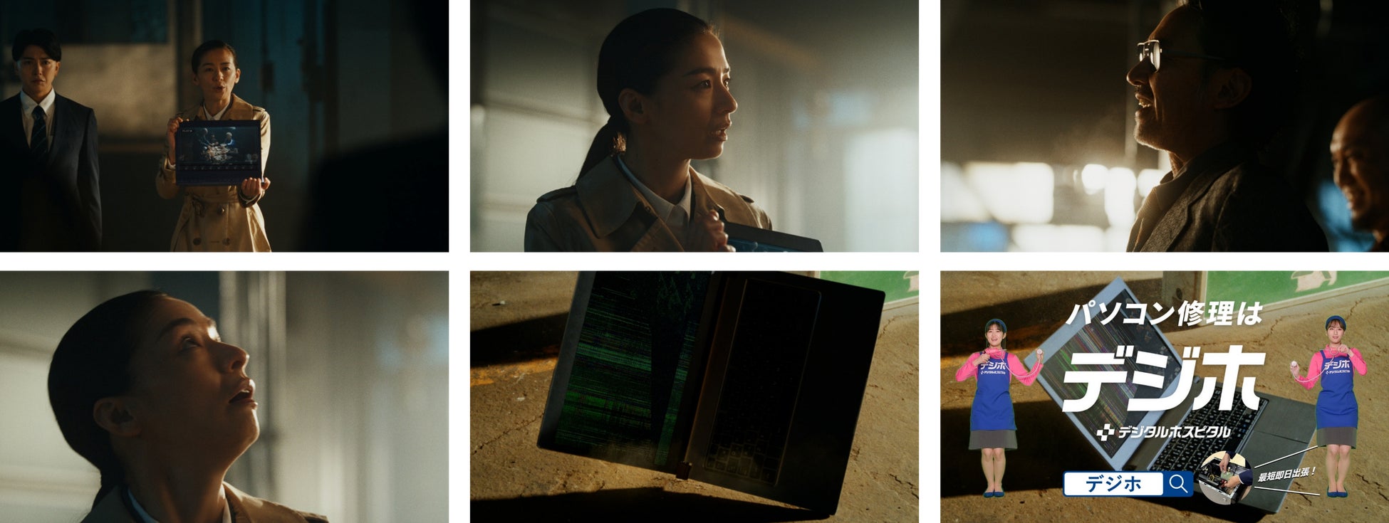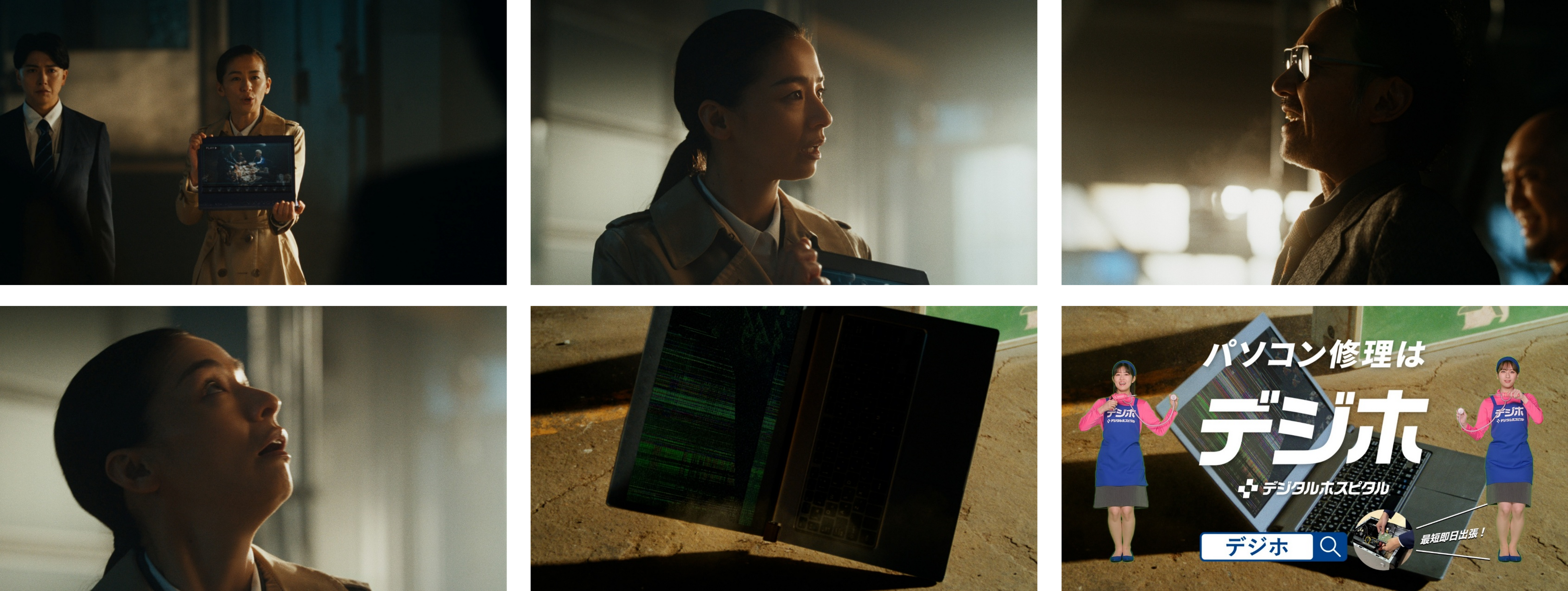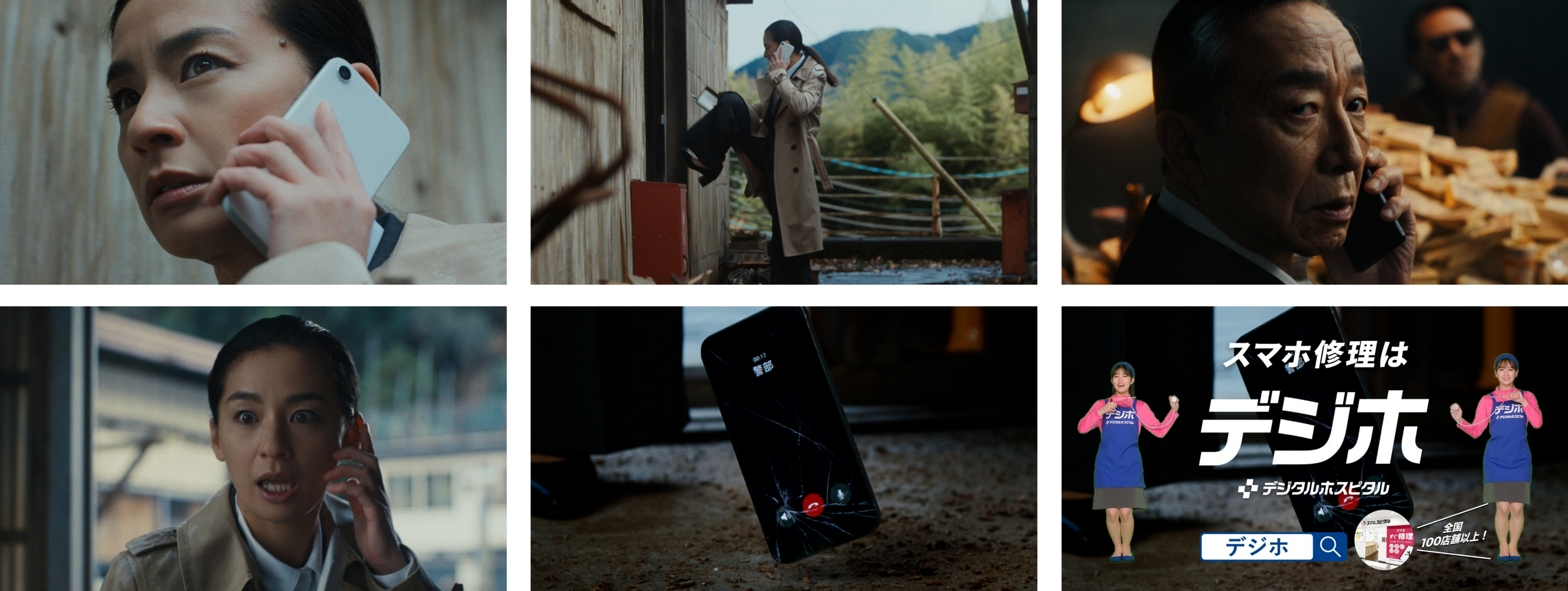 尾野真千子さん演じる勇猛果敢な刑事と、犯罪組織との緊迫感あふれる攻防戦を描き、ストーリーは予想外のデジタルトラブルへと転じていきます。最後はシリアスな世界観から一転、「スマホ修理はデジホ♪」「パソコン修理はデジホ♪」とコミカルに締めくくられます。クライムサスペンス映画を思わせる迫力ある映像と、シュールな結末の温度差にもご注目ください。