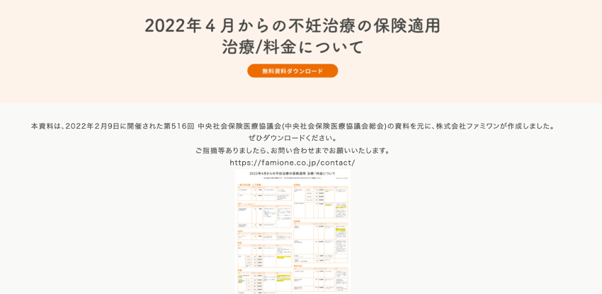 「子どもを願うすべての人によりそい 幸せな人生を歩める社会をつくる」をビジョンに掲げ、LINEを活用した妊活コンシェルジュサービス「famione(ファミワン)」 https://lp.famione.com/ を提供する株式会社ファミワン(本社:東京都渋谷区、代表取締役:石川勇介)は、2022年2月9日に開催された第516回 中央社会保険医療協議会(中央社会保険医療協議会総会)の資料を元に、「生殖補助医療に係る評価の新設」に関する一覧表を作成し、無料公開を行いました。