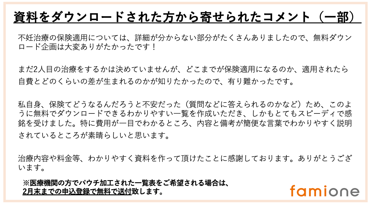 「不妊治療の保険適用については、詳細が分からない部分がたくさんありましたので、無料ダウンロード企画は大変ありがたかったです! 今から、体外受精に挑戦する夫婦や、すでに妊娠はしているが保管している受精卵を預けている人にも保管料が保険適用になりいくらになるのか知れた人もいます。今後も、正しい情報をお金を取らず困っている人、ママになるために頑張っている人たちに正しく有益な情報を提供お願い致します☺︎」