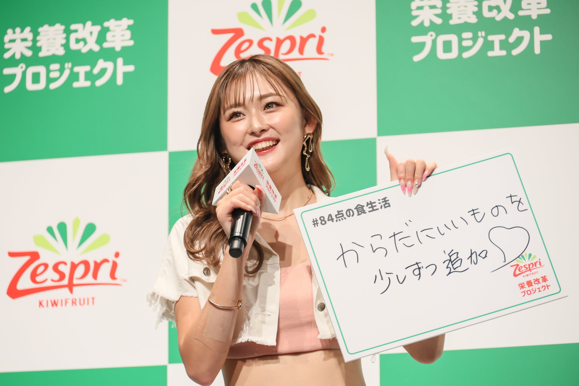ゼスプリキウイ公式アカウントでは、楽しく手軽に84点くらいを目指す方法を「#84点の食生活」をつけて投稿してもらうキャンペーンを行います。そこで、ゲストの皆さんにも、「#84点の食生活」をフリップに記入していただき、発表しました。ゆうちゃみさん「“体にいいものを少しずつ追加”です。コンビニでも手軽に買えるもので、ちょっとずつ栄養を増やしていきたいです。ちょっとずつ頑張ろうと思います」、ヒコロヒーさん「“豆乳で割る”私は出来が悪いので、できることから始めて、自分なりの84点を目指したいと思います」、加納さん「“出勤キウイ”です。キウイを行きがけに食べようと思います。家で食べるフルーツのハードルが高くなっていると感じますが、コンビニでも手軽に買えるようになっていますし、キウイ1個を行きや帰りに買うでもいいと思います」、くわばたさん「“忙しくても84回噛む”です。この職業をやっていると、2,3回ぐらいしか噛んでないんですね。子ども達と食卓を囲んでゆっくり噛むことを心がけたいと思います」とそれぞれ宣言をしてイベントを締めくくりました。