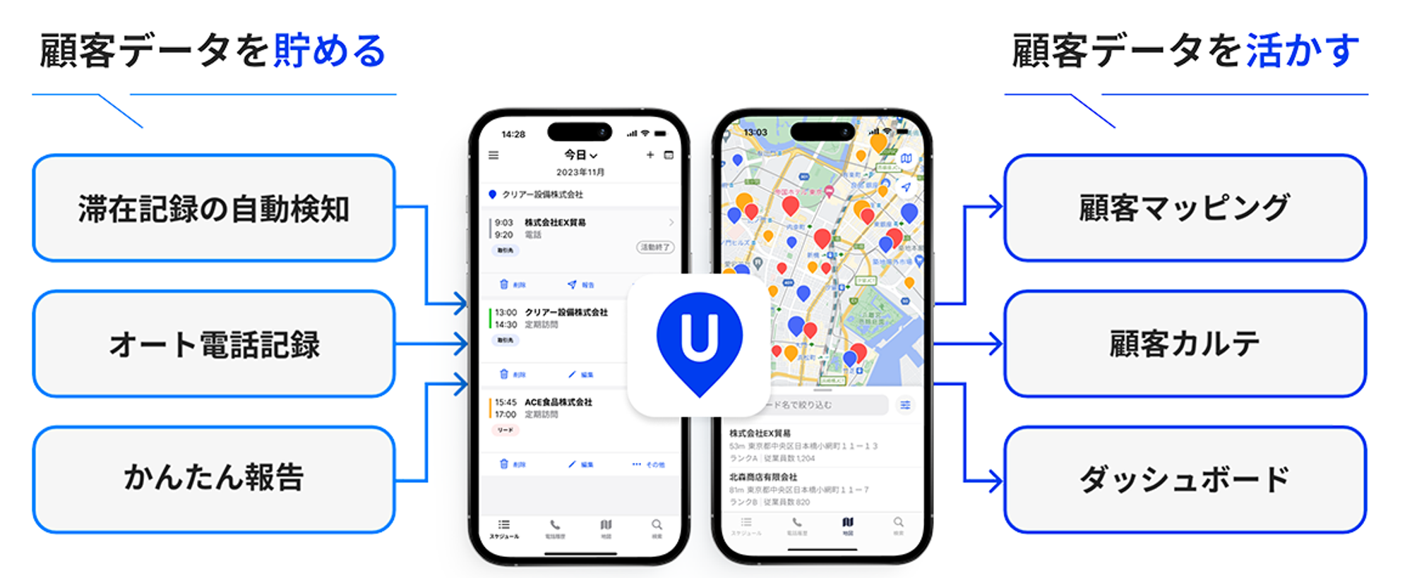 「UPWARD」はCRM・SFAの価値を最大化する「セールスエンゲージメント」を実現するアプリです。顧客データを「貯める・活かす」ことを軸に、クラウドCRMと連携し、外回り・訪問営業の方々がより創造的に働けるよう、多様なサポート機能を提供します。