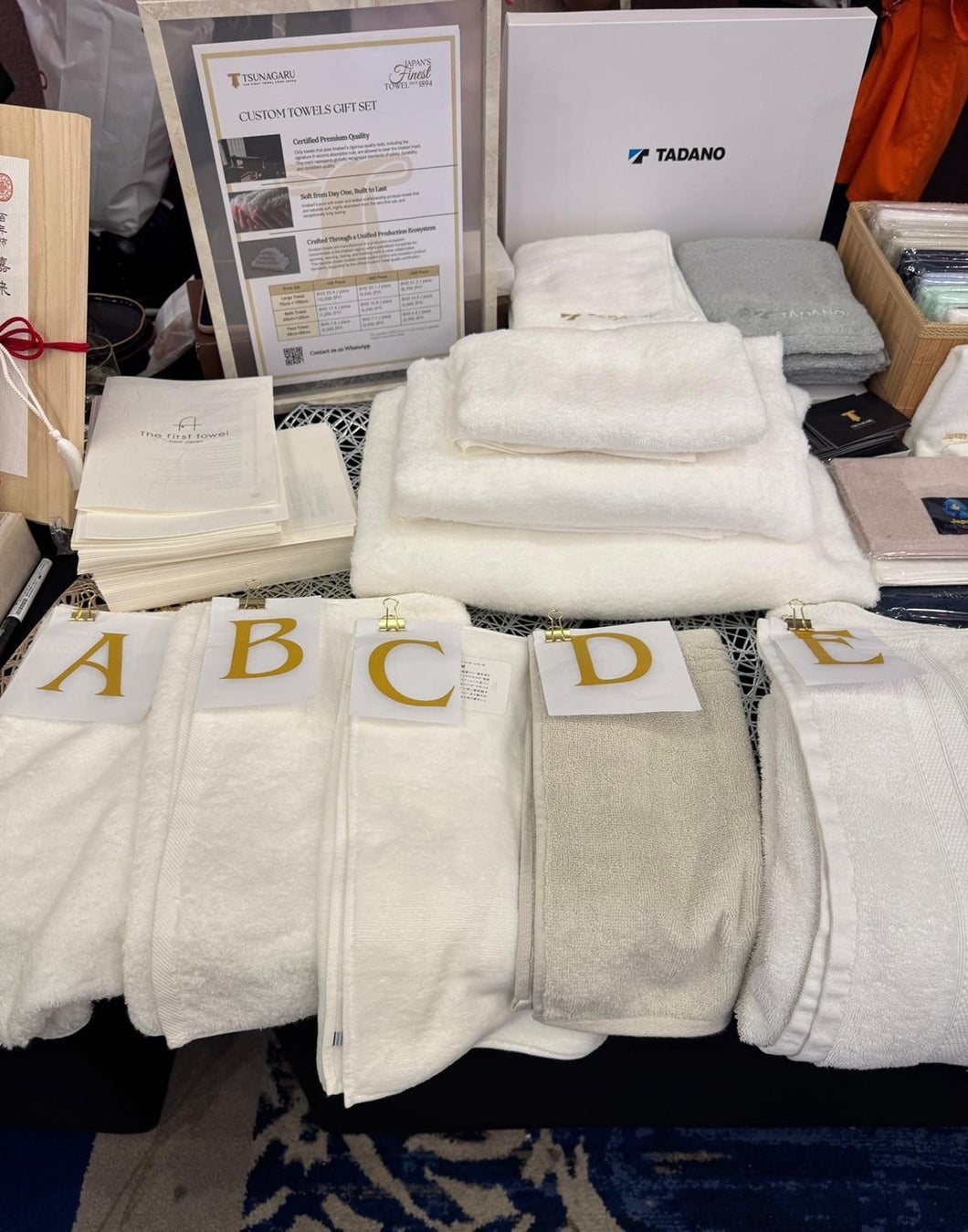 ツナガルタオルのブースでは、日本を代表する高品質ブランド「今治タオル」を展示。触感や厚み、吸水性の異なる5種類を来場者に実際に比較いただき、中東市場における嗜好性や商品受容性のヒアリングを実施しました。上質で柔らかな質感への評価は非常に高く、ラグジュアリーホテル向けアメニティやVIPギフト市場との親和性が確認されました。
