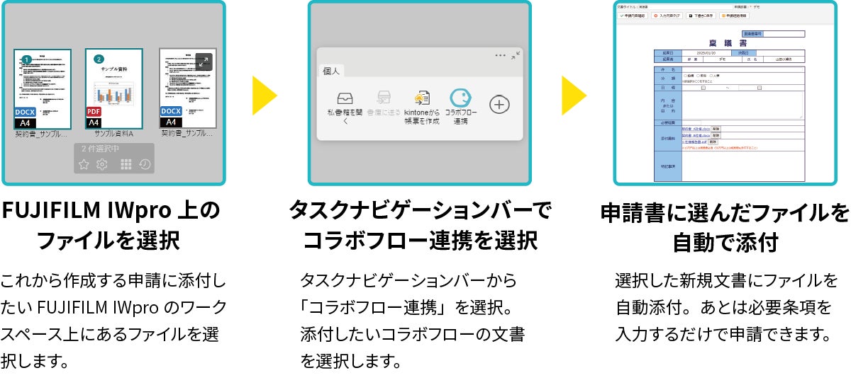 今回のサービス連携により、FUJIFILM IWproの利用者はワークスペース上のファイルをコラボフローに直接添付し、シームレスに申請を行うことができるようになります。