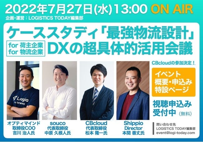 ITを活用し運送業界における新たな価値の創出を目指すCBcloud株式会社(本社:東京都千代田区、代表取締役CEO:松本隆一、以下「CBcloud」)は、2022年7月27日(水)13:00から開催されるLOGISTICS TODAY主催の物流ウェビナー「ケーススタディ『最強物流設計』for 荷主企業・物流企業 DXの超具体的活用会議」に登壇します。