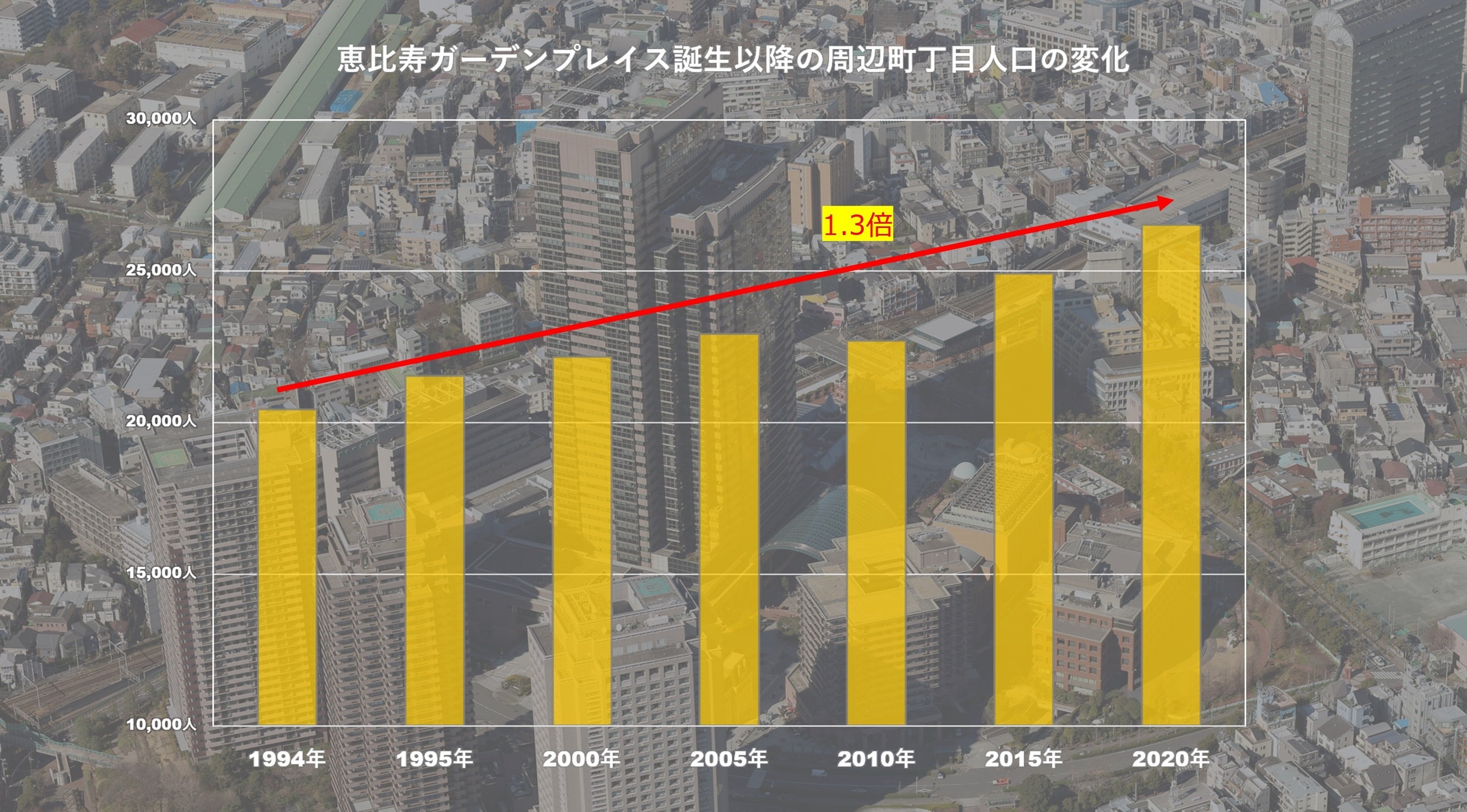 1994年の開業以降、周辺(恵比寿1~4丁目、恵比寿南1~3丁目、恵比寿西1,2丁目、三田1丁目)の人口は約1.3倍に増加していることが分かりました。