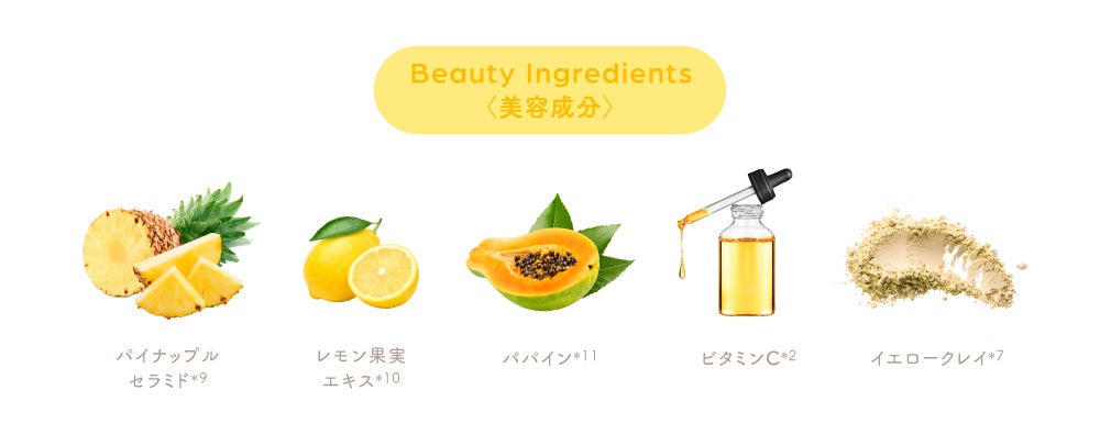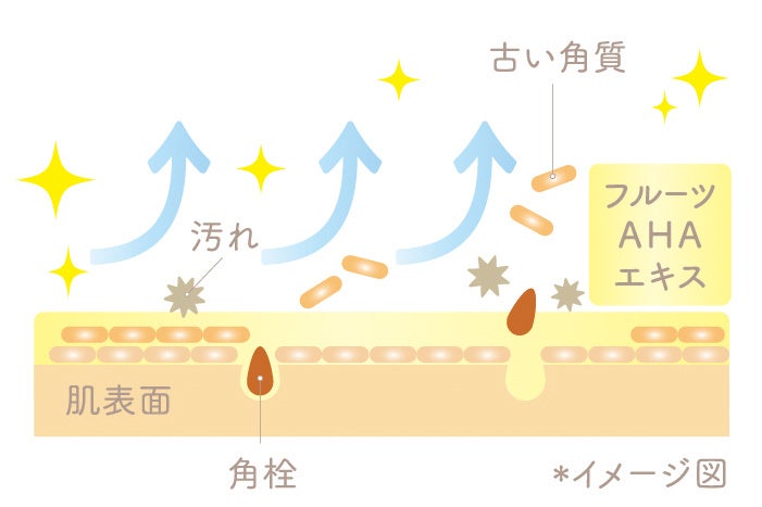 フルーツ酸とフルーツエキスを独自に配合した「フルーツAHAエキス※8」、ビタミンC※2などの毛穴&角質ケア成分を配合。うるおいをキープしながら古い角質や汚れをやさしく落とし、毛穴汚れやくすみ※4の気にならないフレッシュ&クリーンな肌へと導きます。