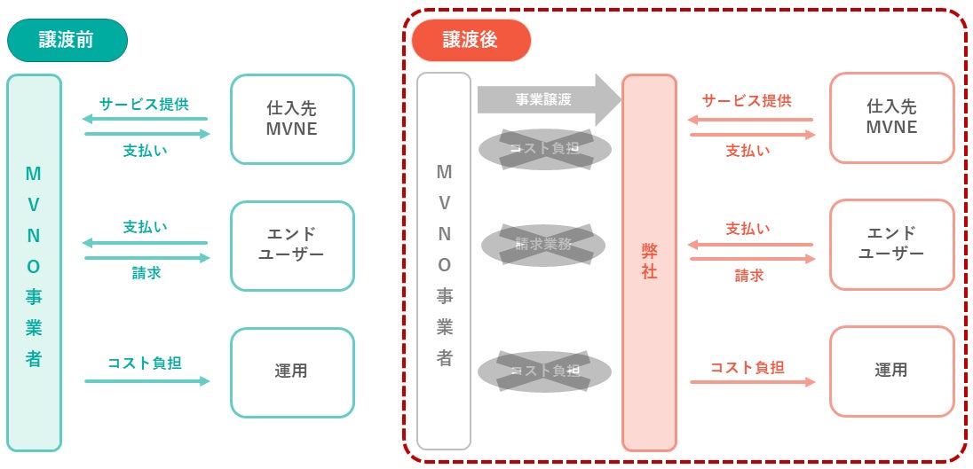 本サービスによる事業譲渡では既存のサービス内容を変更することなくそのまま当社が事業を譲り受けることから、当社が仕入先であるMVNE等への支払いやエンドユーザーへの請求・サポートを一貫して行うほか、カスタマーサポートなど運用・保守面についても対応するため、既存ユーザーが引き続きサービスを同一内容同一品質にて利用し続けることができます。MVNO事業を譲渡する事業者は、これまで毎月発生していたカスタマーサポート・請求・支払といった運用コストを削減することが可能です。また、エンドユーザーからこの事業譲渡によるクレームや風評被害が発生する可能性を可能な限り抑えた形で安心して事業を譲渡することができます。