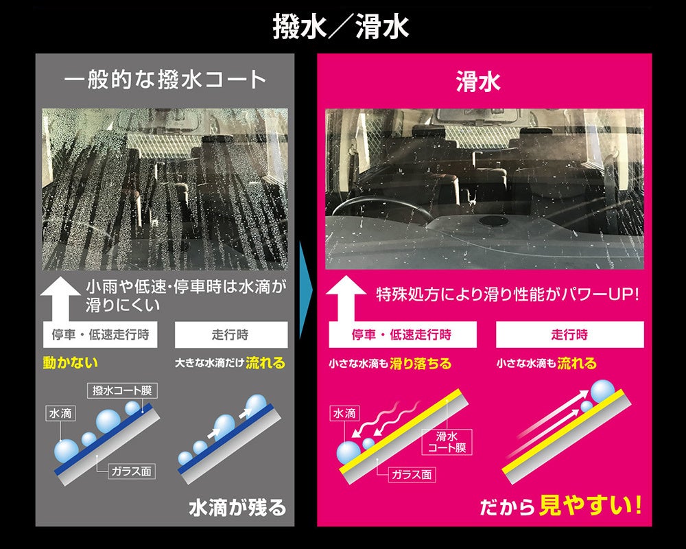 驚異の水滑りを実現した「滑水」コート!フロントガラス表面に残る水滴量が少なく視界が見やすくなる。突然の雨にすぐ使えるスピード施工タイプ。走行中も停車中も視界クリアな新感覚ガラスコートです。