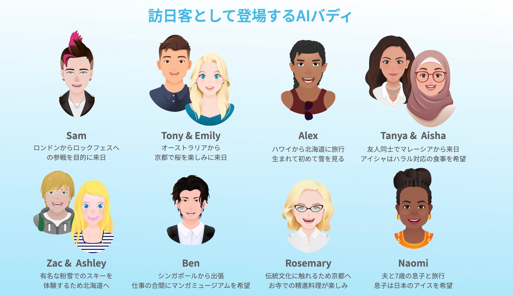 会話相手となるAIバディたちには、出身地や年齢・性格など具体的なバックグラウンドが設定されており、今回のコンテンツでもそれぞれのキャラクター性にあった旅行を楽しんでいます。また、接客シーンや日本の観光地ならではの描写(ホテルフロントや客室、温泉や美しい雪景色など)を用いつつ、ロケーションを移動することで、ストーリーを楽しみながら飽きることなく学習を続けていただけるよう工夫しています。