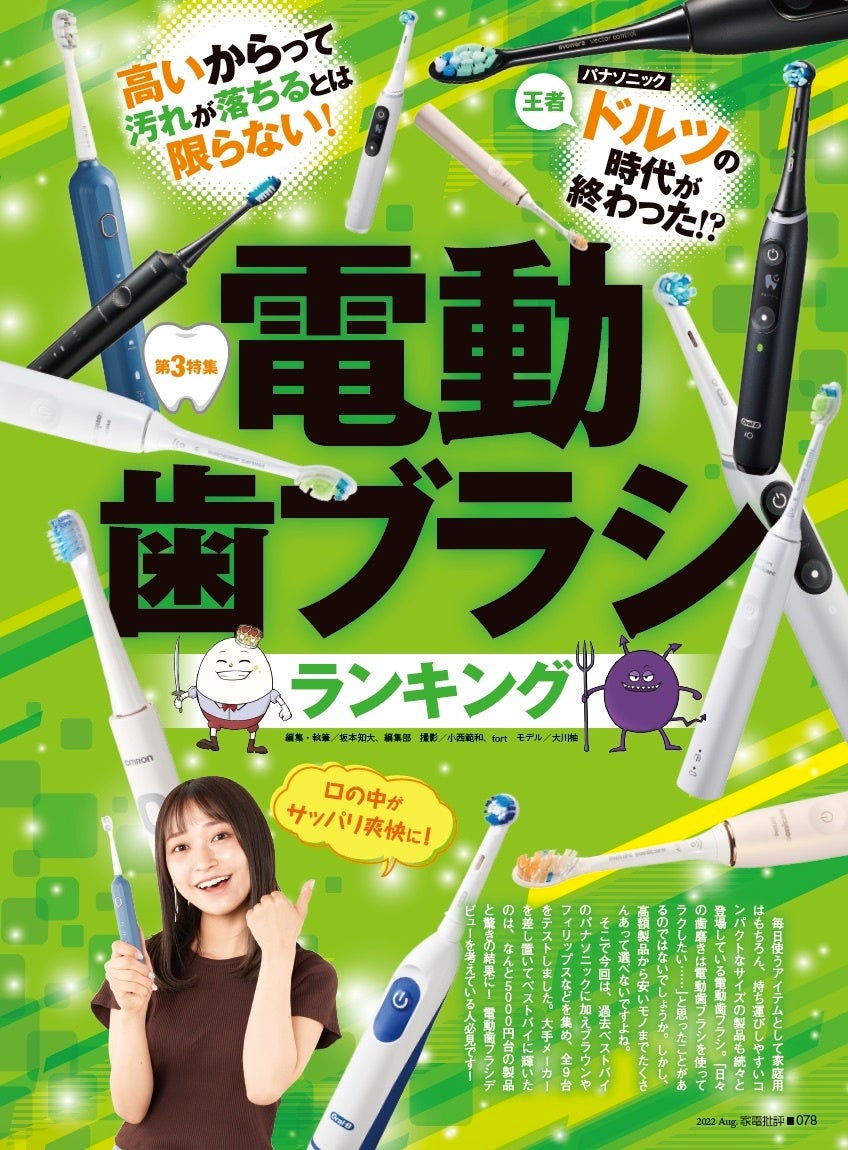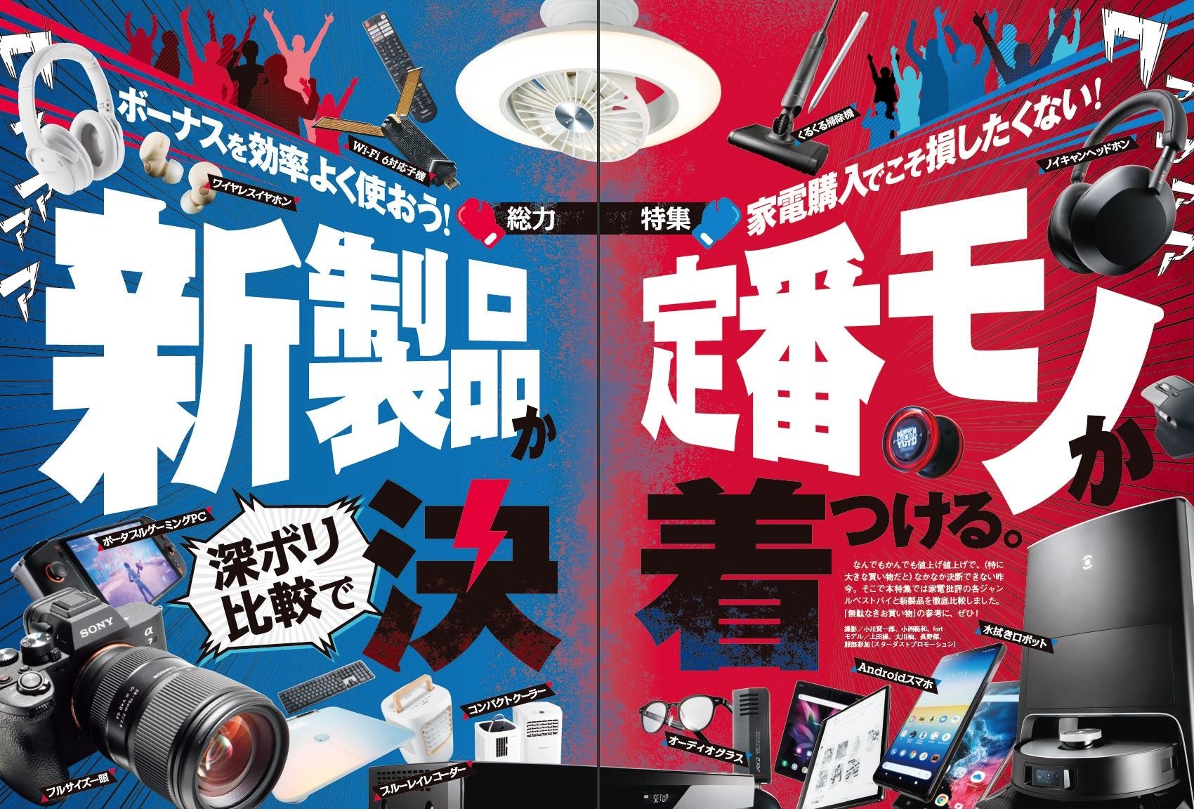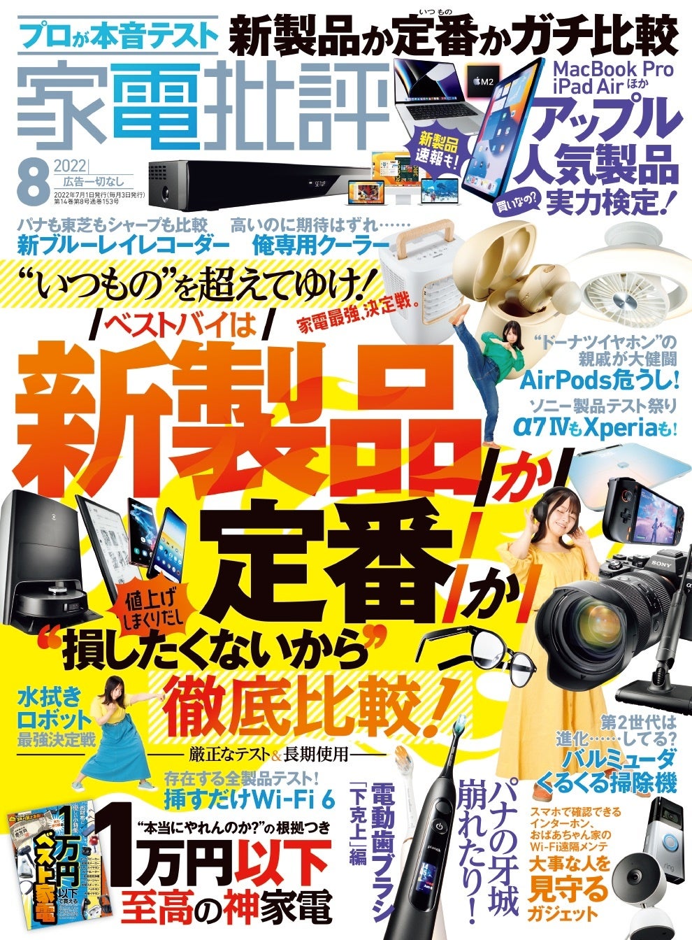 8月号では、新製品と定番モノを徹底比較! 世にあふれる新製品は、本当に定番モノよりも高性能なのかをガチ検証。ヘッドホンやスマホ、ブルーレイレコーダーなど、値上げラッシュの中でも買って損しないベストバイアイテムを探しました! そのほかにも、汚れ落ち&コスパ最強の「電動歯ブラシランキング」や、お財布に優しい「1万円以下で買えるベスト家電」など、暮らしを快適に変える家電情報満載でお届けしています。 本リリースでは、商品テストに基づく編集部おすすめのベストバイ製品の一部をご紹介します。