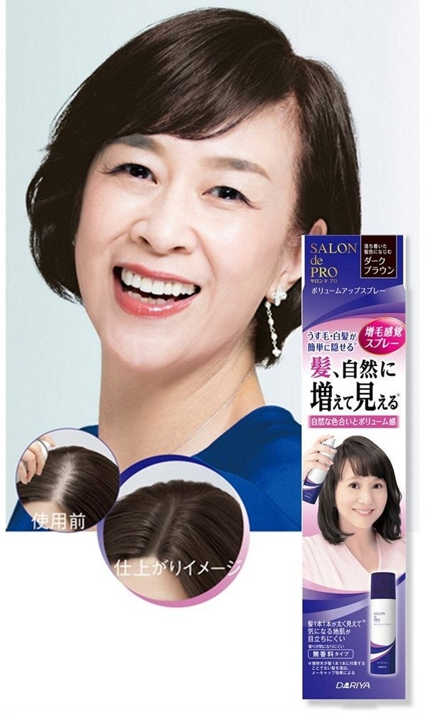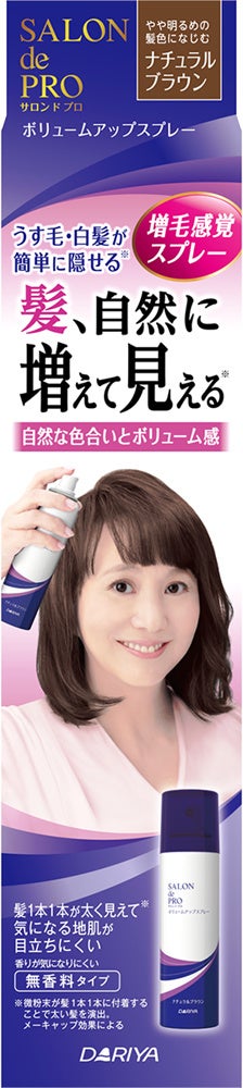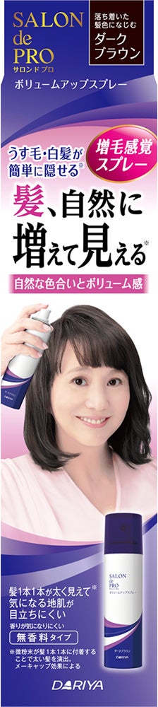 株式会社ダリヤ(本社:名古屋市中区、代表取締役社長:野々川 純一)が展開する、大人の髪悩みをケアする「サロン ド プロ」から、「ボリュームアップスプレー」が新登場!年齢を重ねるにつれ、女性はうす毛・髪のボリュームダウンに対する悩みが強くなるもの。白髪や頭皮の透けが気になる部分にスプレーをするだけで、微粉末が髪1本1本に付着し、うす毛・白髪を自然に隠しながら太く、はり・コシのあるボリュームヘアを演出します。椿オイルや海藻エキスなど髪にやさしい4つのトリートメント成分を配合。雨や汗で落ちにくく自然なボリューム感が持続します。シャンプーで簡単に洗い落とすことができるのも便利。へアカラーした髪にも自然になじむ、2色をご用意しました。