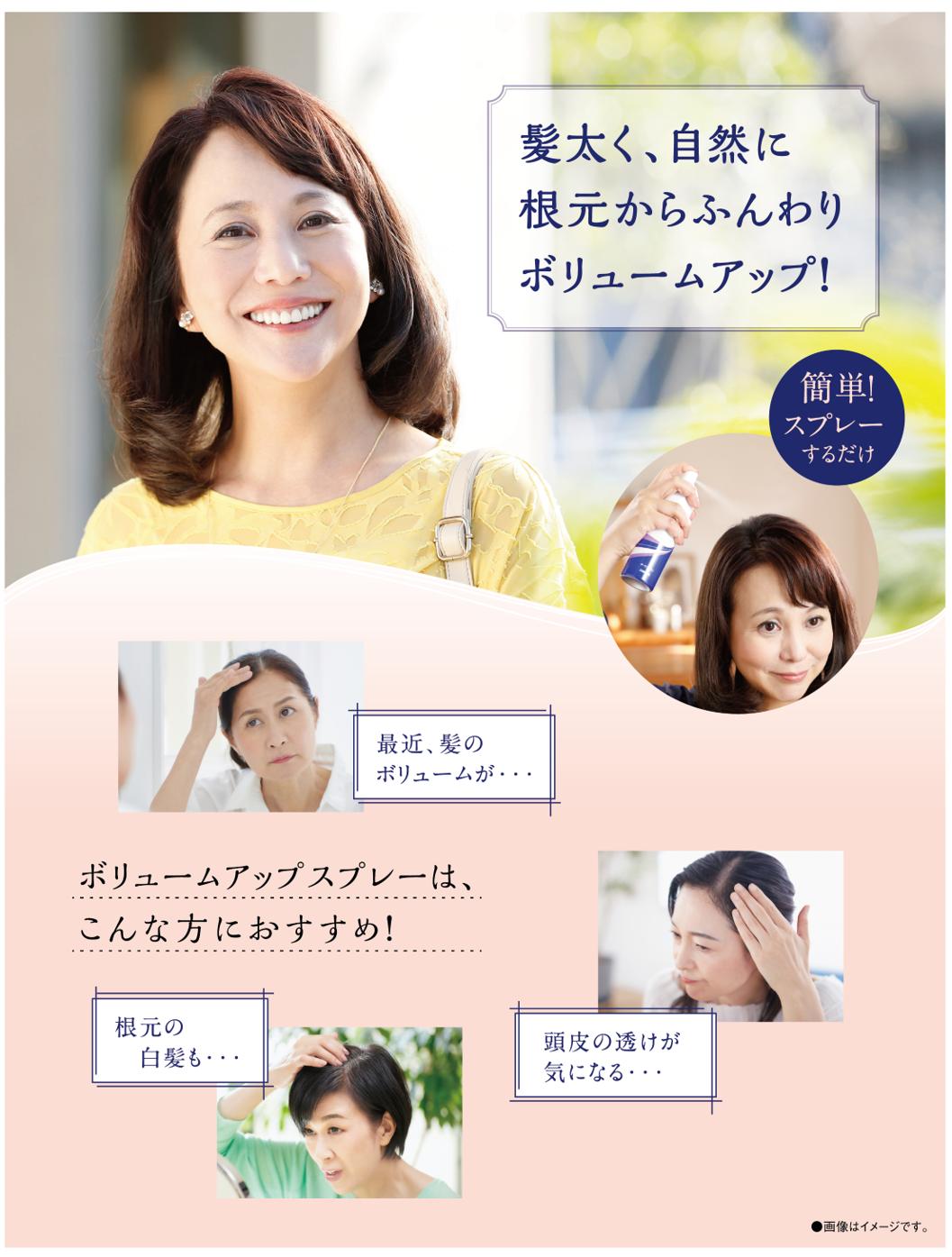 微粉末が髪1本1本に付着することで、太く、はり・コシのあるボリュームヘアを演出し、気になる白髪も頭皮の透けも同時に目立たなくなる増毛感覚スプレーです。