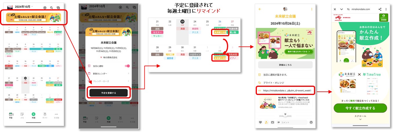 「未来献立®」は、栄養バランスの考えられた献立をレコメンドする味の素株式会社さまのWebサービスです。家族利用の多いTimeTreeのユーザーに対し、「家族で献立会議しよう」といった訴求で、「未来献立®」のサービス認知、献立会議の習慣化を目的として配信を行いました。