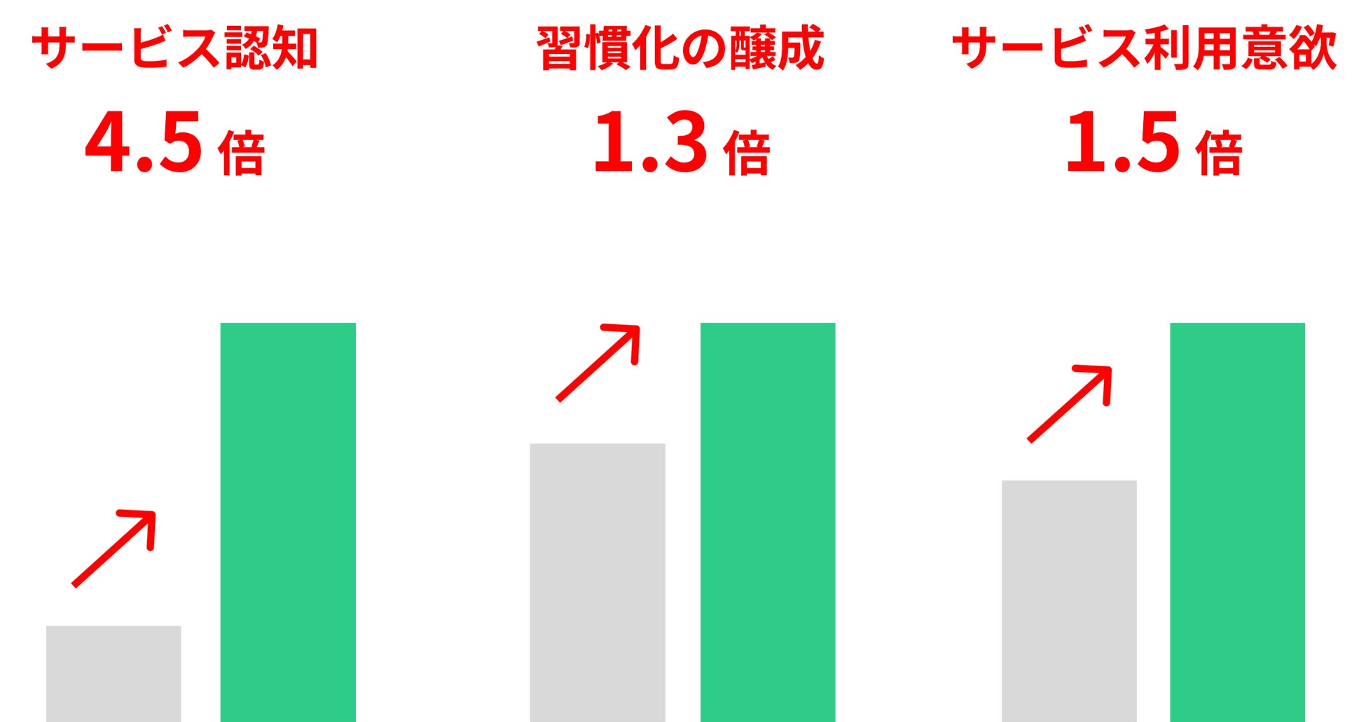 広告掲載後のブランドリフト調査では、習慣化広告に接触したユーザーが非接触ユーザーに比べ、サービス認知が4.5倍、習慣化の醸成が1.3倍、利用意欲が1.5倍に向上しました。