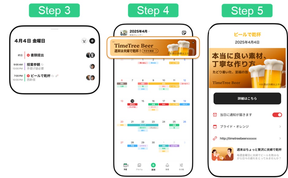 TimeTreeアプリ上の配信面(マンスリー面、デイリー面、予定作成完了面)から予定登録訴求を行います。
