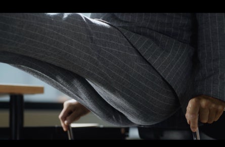・ストーリー:グレーのメリノジャージースーツを着たスーツ1年生・山田勝己さん。カメラが徐々に引いていくと、椅子の肘掛けをあん馬に見立て、足を上へまっすぐに持ち上げていく姿が映し出されます。その動きに合わせて、お尻まわりの生地がしなやかに伸び、ジャージースーツの凛とした立体感と優れた伸縮性が際立ちます。