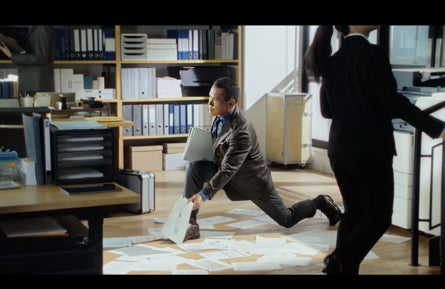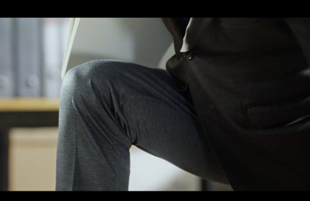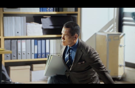 ・ストーリー:「TRAVELER」シリーズのジャージージャケットとパンツを着たスーツ1年生・山田勝己さん。カメラが徐々に引いていくと、床に手を伸ばし、ランジの姿勢で散らかしてしまった書類を拾い上げる姿が映し出されます。徐々に上体を起こしていく最中、膝の生地が伸びる様子がアップとなり、ジャージーの快適な伸縮性をアピールします。
