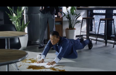 ・ストーリー:「ONLY GREEN」コレクション・ブルーのジャージーセットアップを着た山田 勝己さん。カメラが徐々に引いていくと、床スレスレまで腹筋ローラーのように腕を伸ばしながら、 床にこぼれたコーヒーを拭く姿が映し出されます。山田さんの動きに合わせて、腕まわりの生地が柔軟に伸び、ジャージーの持つ高い伸縮性が強調されます。