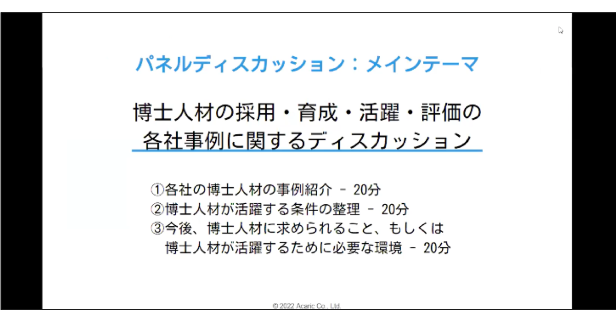 - <パネルディスカッション&質疑応答| 博士人材の採用・育成・活躍・評価に関する各社事例に関するディスカッション> *一部抜粋
