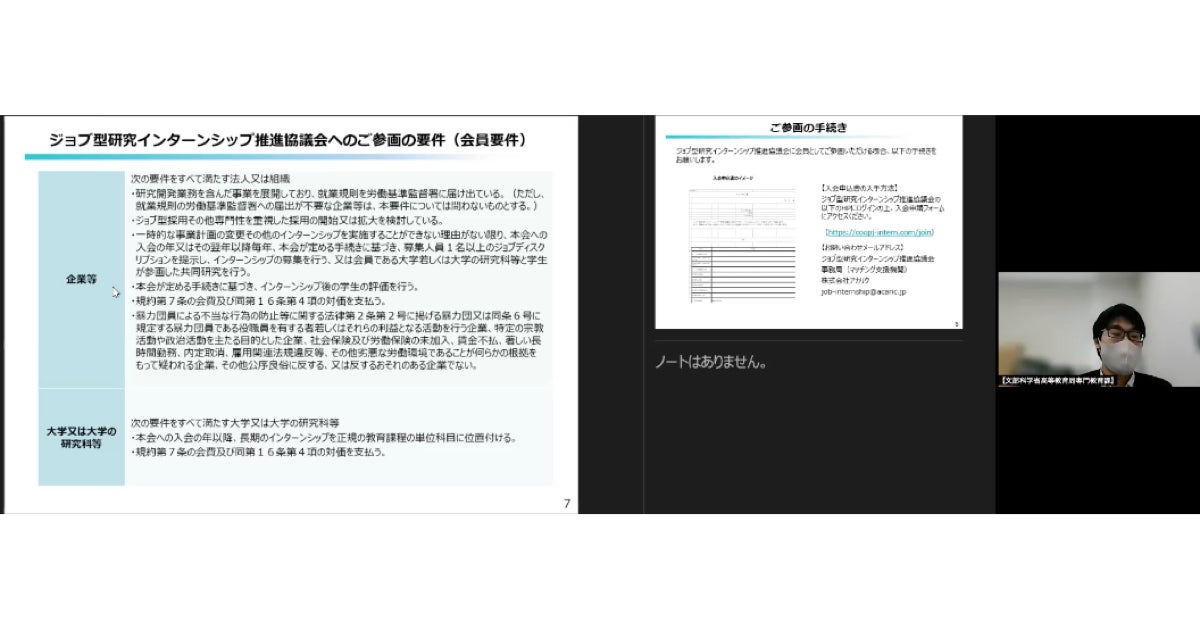 - <基調講演②|「ジョブ型研究インターンシップ(先行的・試行的取組)等について」文部科学省 高等教育局 専門教育課 担当官 木谷慎一氏>