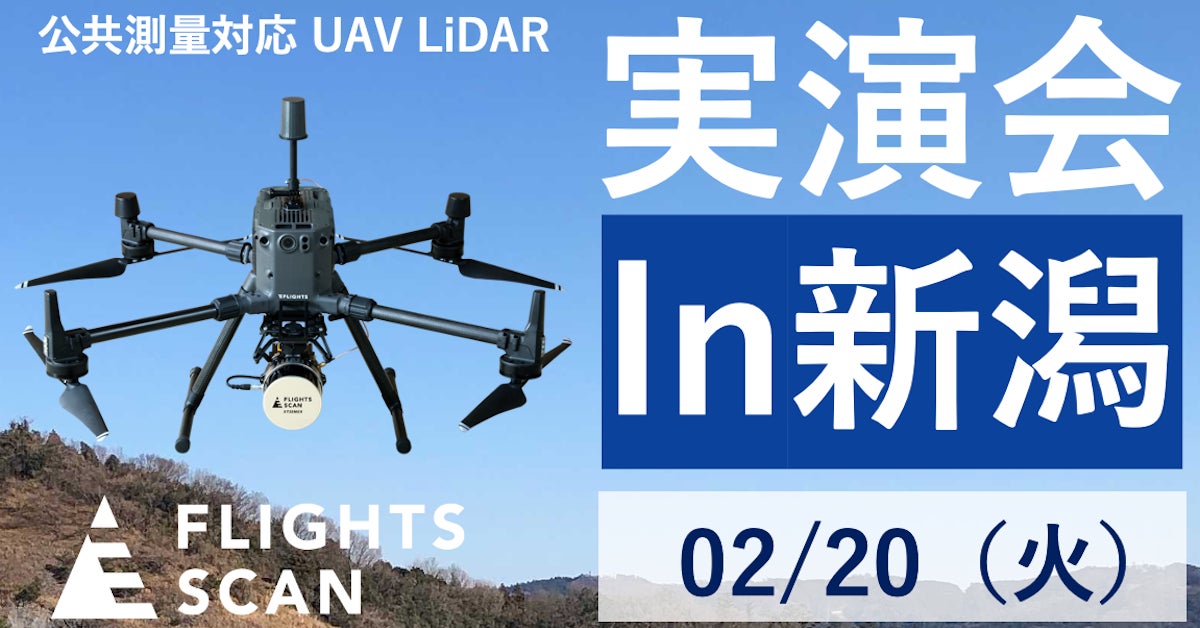 株式会社FLIGHTS(本社:東京都渋谷区、代表取締役:峠下周平、以下:FLIGHTS)は、2024年2月20日(火)、新潟県にて株式会社シーティーエス(本社:長野県上田市、代表取締役社長:横島泰蔵、以下:シーティーエス)とドローンレーザー実演会を共催します。 お申込:https://flights-scan.com/event/demo-niigata/