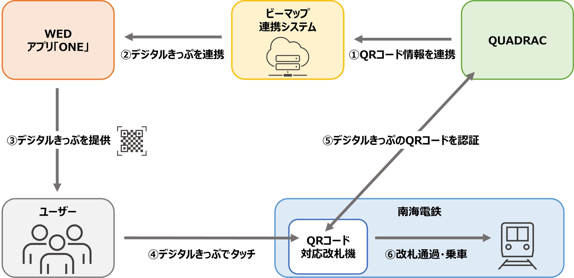 当社は南海電鉄と協力し、「ONE」と、南海電鉄のQRコード対応改札機と連携しているQUADRAC株式会社提供の交通クラウドサービス「Q-move」を結びつける連携システムを開発しました。Webブラウザやスマートフォンアプリからデジタルきっぷの取得を可能にした本システムを活用し、Maas・インバウンド・集客の様々なソリューションと連携を進めていきたいと考えております。
