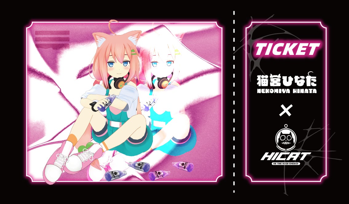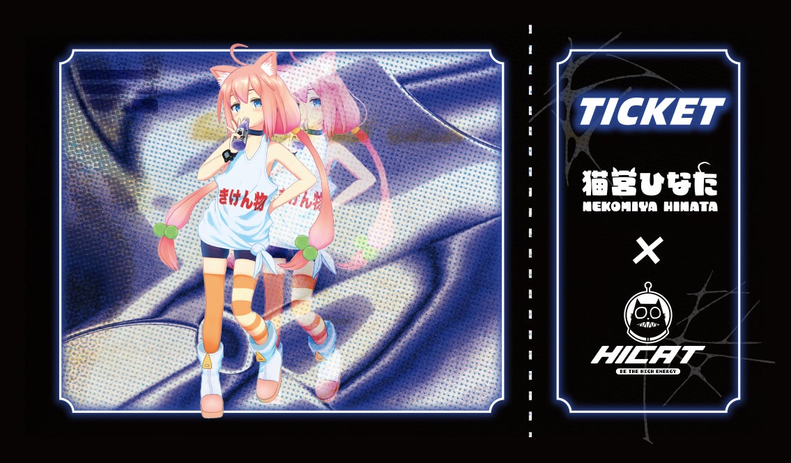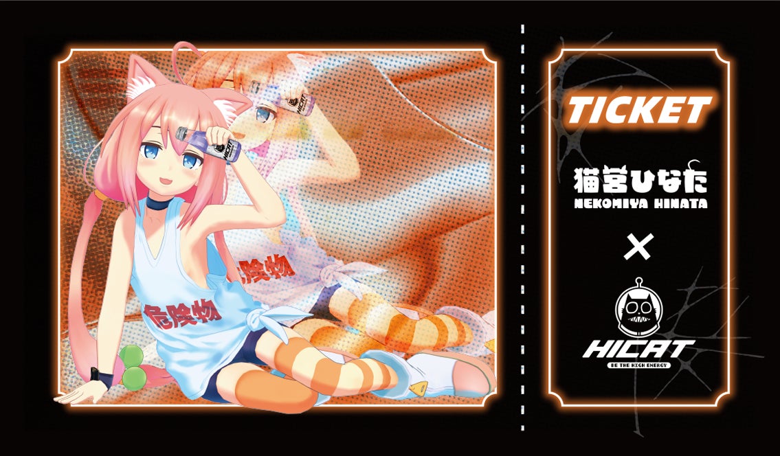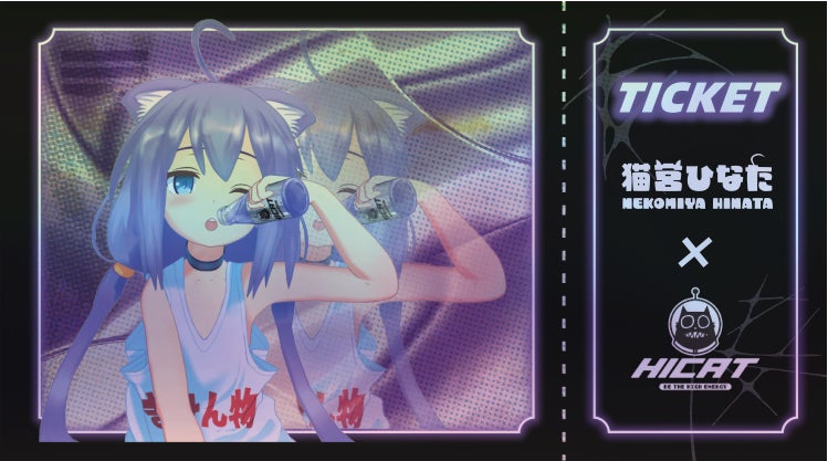 今回のコラボではメタバースや仮想空間を意識しつつ、航空券のようなデザインに仕上げました。HICATはマタタビを配合したエナジードリンクということで、猫宮ひなたがまるでマタタビに酔っているかのような表情や仕草が目を惹くデザインとなっております。