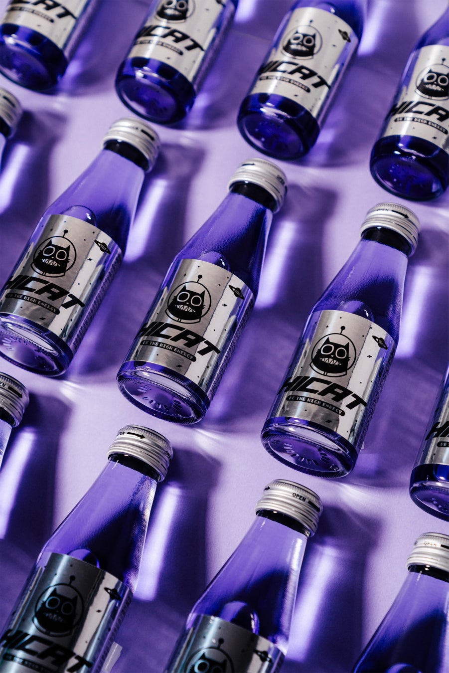 瓶のボトルに紫色のドリンク、銀のラベルが特徴で、宇宙×猫をイメージした個性的なデザインになっています。フルーティーで飲みやすい微炭酸フレーバーで、カフェインを配合していないため、夜でも飲むことができます。