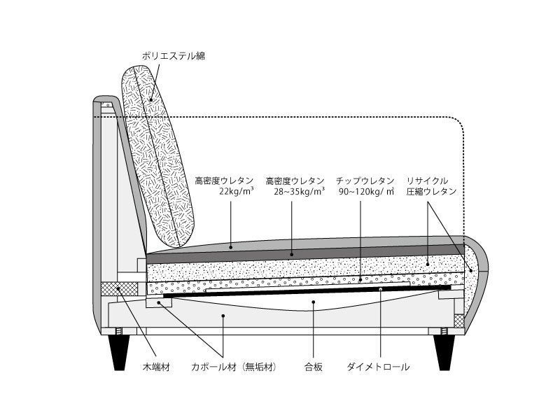 座面には高密度ウレタンの端材を圧縮させた新素材リサイクルウレタンや、背クッションにはフェザータッチにこだわったポリウレタン素材を採用し、優れた耐久性とコストパフォーマンスを同時に実現しています。