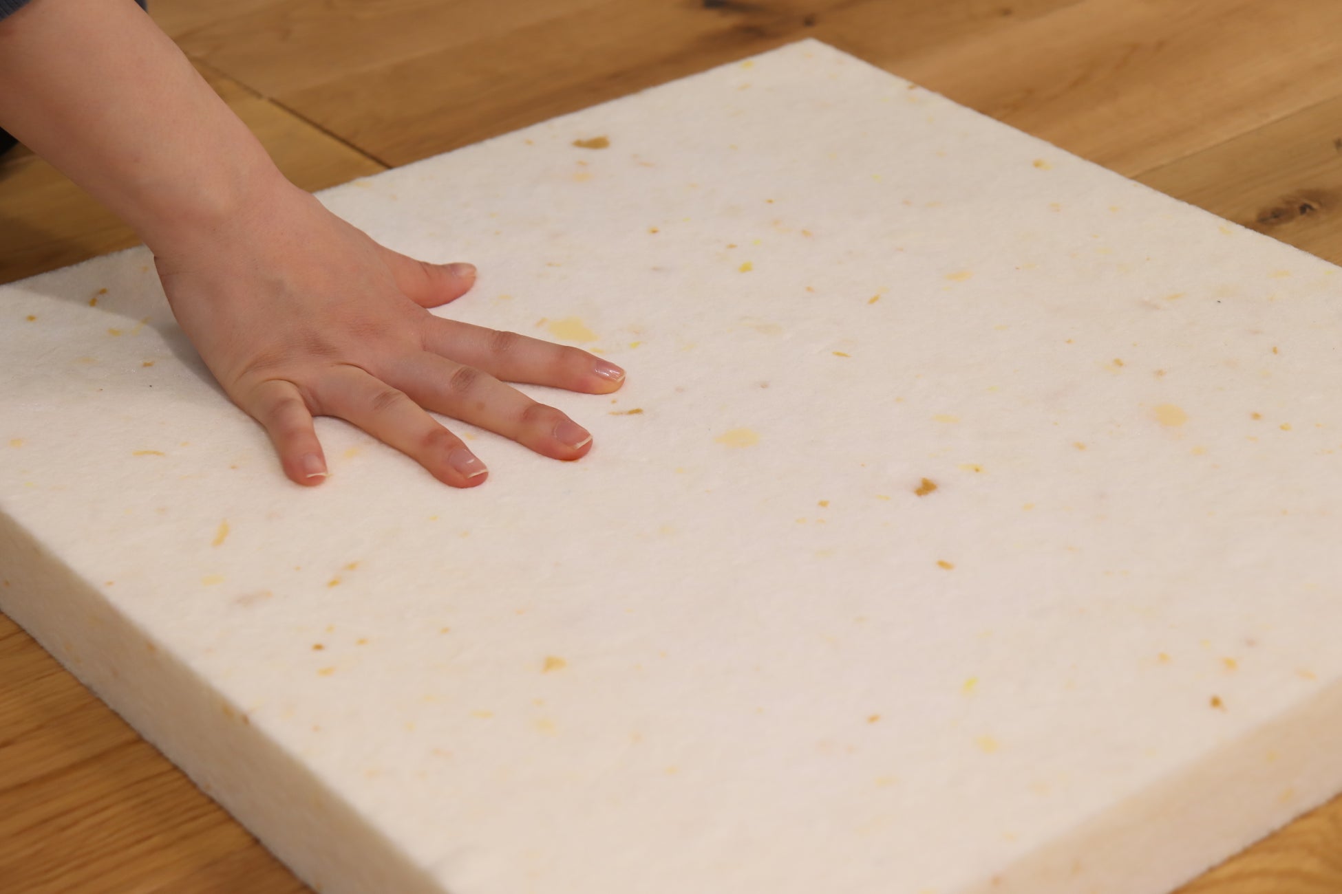 背クッション:ソファのお悩み1位がクッション材のヘタリ。どうしたらフェザーのようなモチモチとした触感と復元力を、ポリウレタン素材で再現できるかに大変頭を悩まされました。最終的に、素材の形状を変更したことはもちろん、中袋の仕様もアレンジすることで、モチモチとした触感と復元力を実現することができました。