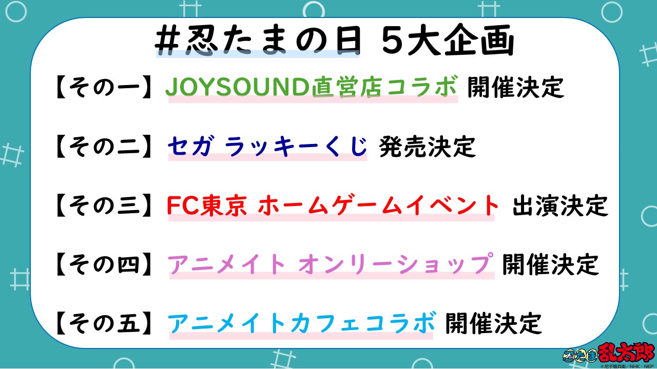 株式会社NHKエンタープライズ(本社:東京都渋谷区 代表取締役社長:有吉伸人)は、当社が版権窓口を管理する「忍たま乱太郎」について、アニメ第1回放送日である4月10日「忍たまの日」に5大企画を解禁したことをお知らせいたします。5月から開幕するミュージカル「忍たま乱太郎」と連動した企画や、カラオケコラボ、カフェコラボなど、さまざまな企画を実施予定です。
