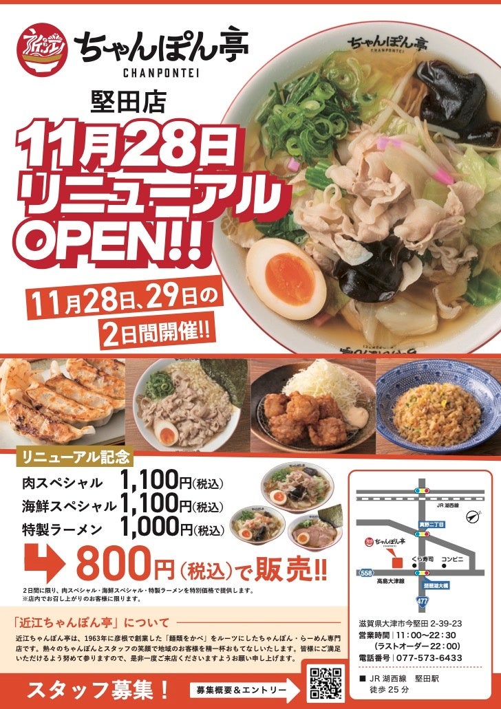 ドリームフーズ株式会社(本社:滋賀県彦根市、代表取締役社長:山本英柱)は、2024年11月28日(木)に「近江ちゃんぽん亭 堅田店」をリニューアルオープンいたします。