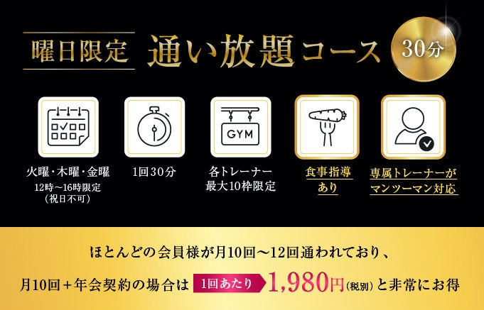 上回る結果だったため、今回は「週3日」に通い放題の曜日を限定し(これでもおそらく一人あたり平均10回〜フルの12回来店を想定)、金額をライトコースで29800円(税別)に設定。
