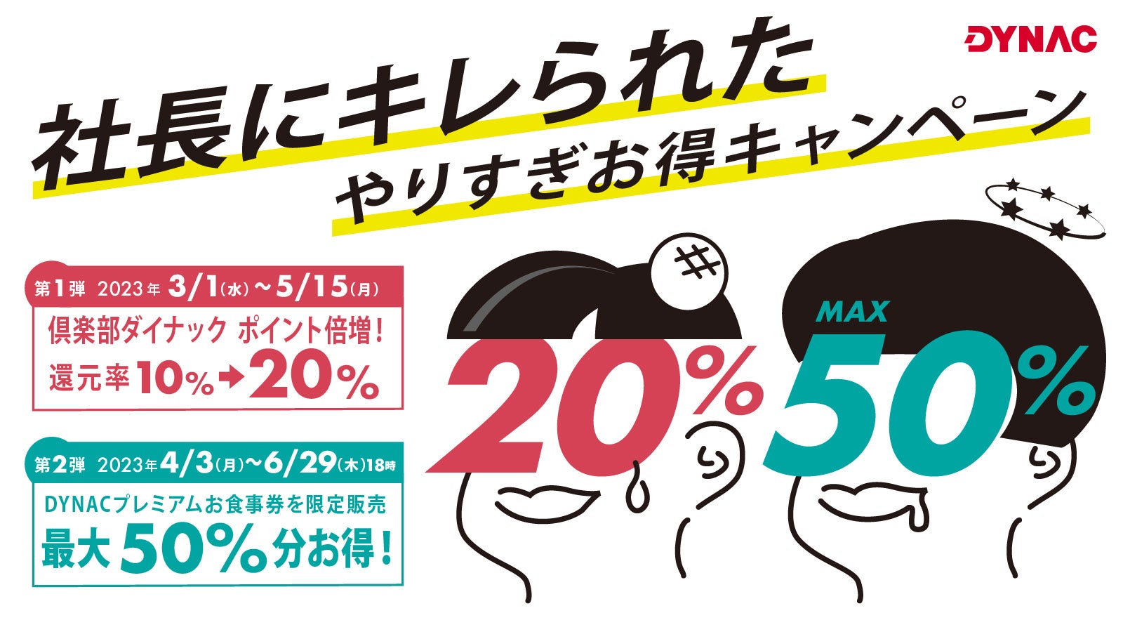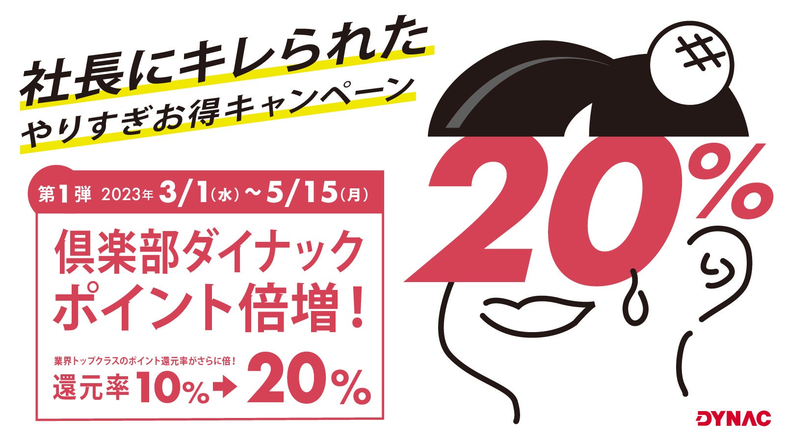 今回の「やり過ぎお得キャンペーン」では、永らくご愛顧いただいている倶楽部ダイナック会員様への感謝の気持ちを込め、さらにポイント還元率を倍増し20%を付与いたします。
