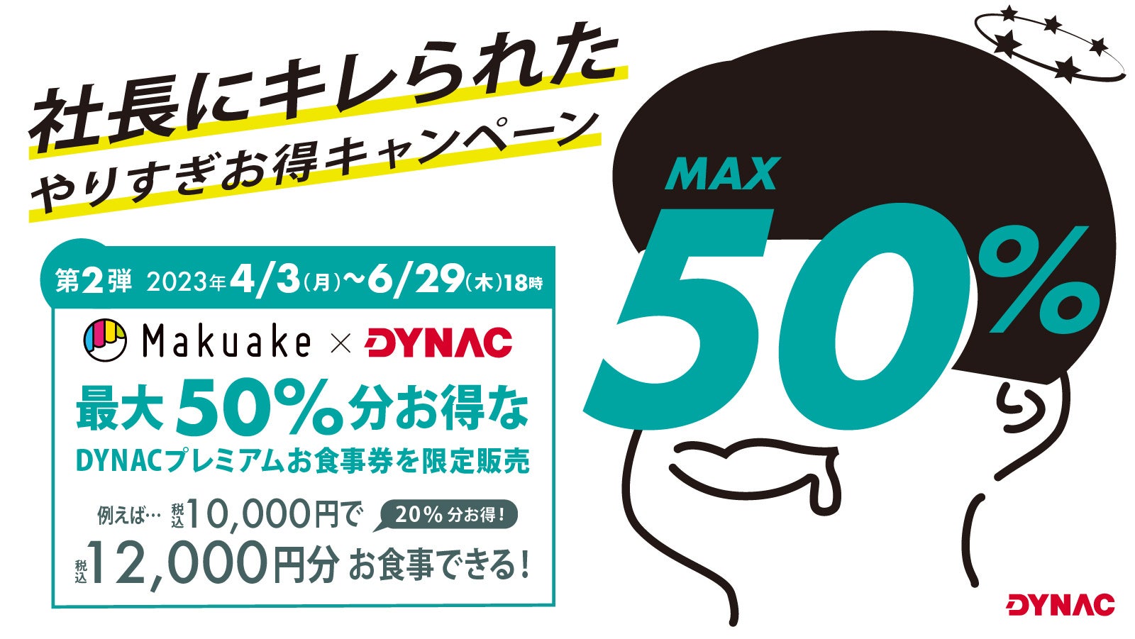 「やりすぎお得キャンペーン」第2弾は、クラウドファンディングサービスMakuake限定で「DYNACプレミアムお食事券」の販売を予定しております。詳細は後日公開予定。ご期待ください。
