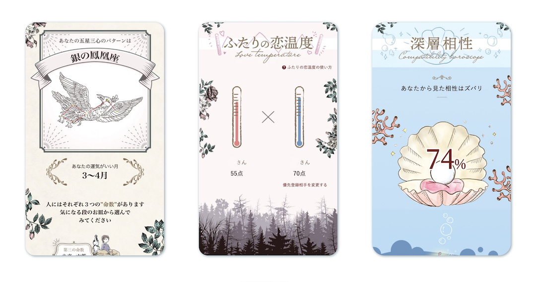 - ふたりの恋温度:今日のふたりの運勢が点数化され、一目でその日の相性が判断できます。