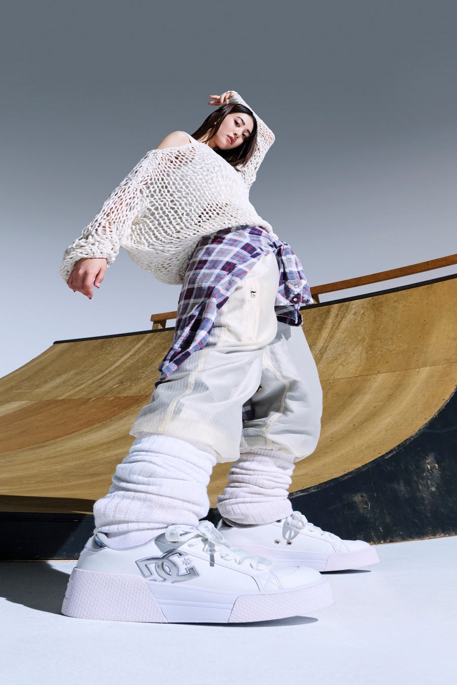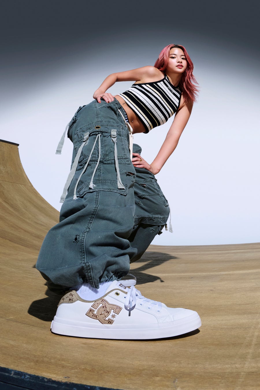2025年春夏シーズンの新モデル「CHELSEA LITE WEDGE SE」は、「DC Shoes」のネームをプリントした幅2cmのリボン風シューレースが特徴のプラットフォームスニーカーです。ホワイトのアッパーにはシルバー、ブラックのアッパーにはゴールドのロゴを配しています。高さ約6cmのボリュームソールとシューレースのアクセントが、ストリートファッションにガーリーなテイストをプラスします。