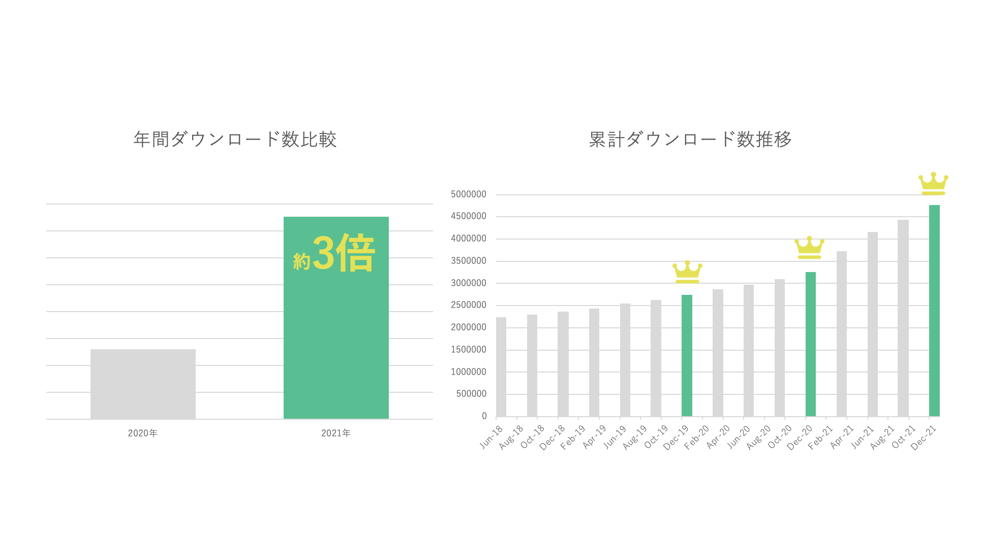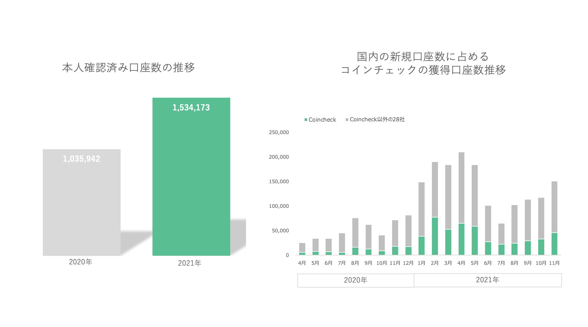 2021年は、TVCMの放映を開始により認知が拡大したことや、「Coincheck NFT(β版)」「Coincheck IEO」などの新規サービスをローンチしたことなどにより、アプリダウンロード数は前年比で3倍となり、累計476万ダウンロードを突破しました。また、本人確認済み口座開設数においても、前年から約50万口座増加し153万口座超となりました。
