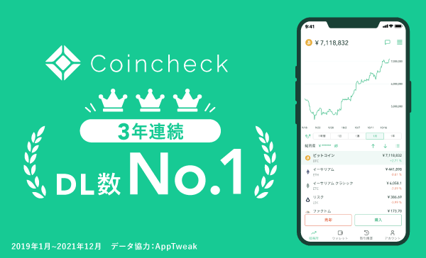 Coincheckアプリ、ダウンロード数3年連続「国内No.1」を獲得