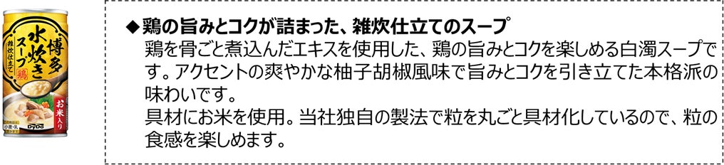 「博多水炊きスープ 雑炊仕立て」は、鶏の旨みとコクが詰まった白濁スープに、爽やかな柚子胡椒風味がアクセントとなり、「博多水炊き※」の本格派の味わいを楽しめるお米入りスープです。