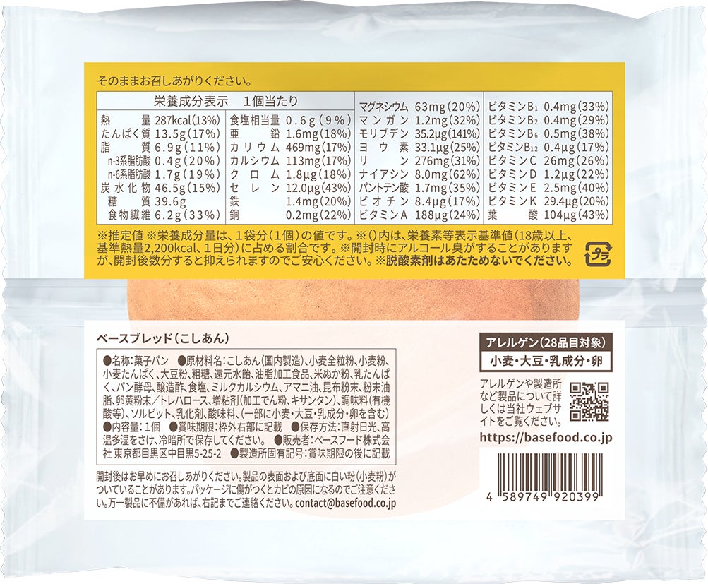 全粒粉ベースのスマートフード完全栄養食「BASE FOOD」北海道産小豆の上品な甘さ「BASE BREAD こしあん」2024年7月9日(火)より新発売