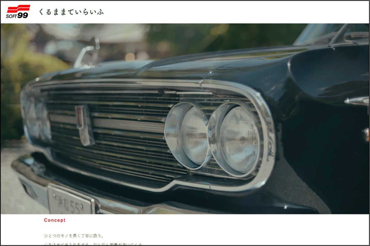 ひとつのモノを長く丁寧に扱う。心を込めて手入れをする。だんだん愛着が湧いてくる・・・ソフト99は、単に新しい車に乗り換えるのではなく「丁寧に扱い、長く大切に乗り続ける」事に大いなる意味を感じています。このようなカーライフスタイルを“くるままていらいふ”と称し、車を長く大切にするカーオーナーの皆様と一緒に取り組んでまいりたいと考えております。